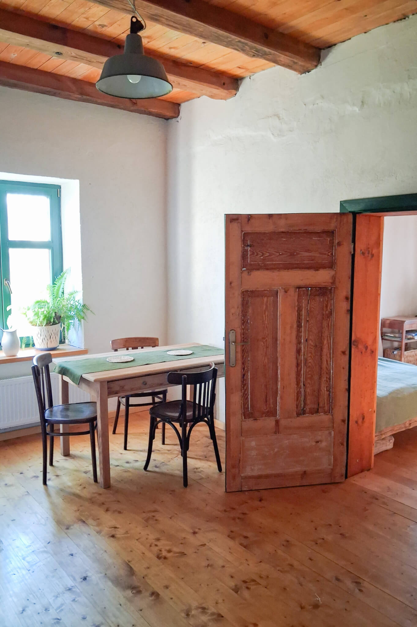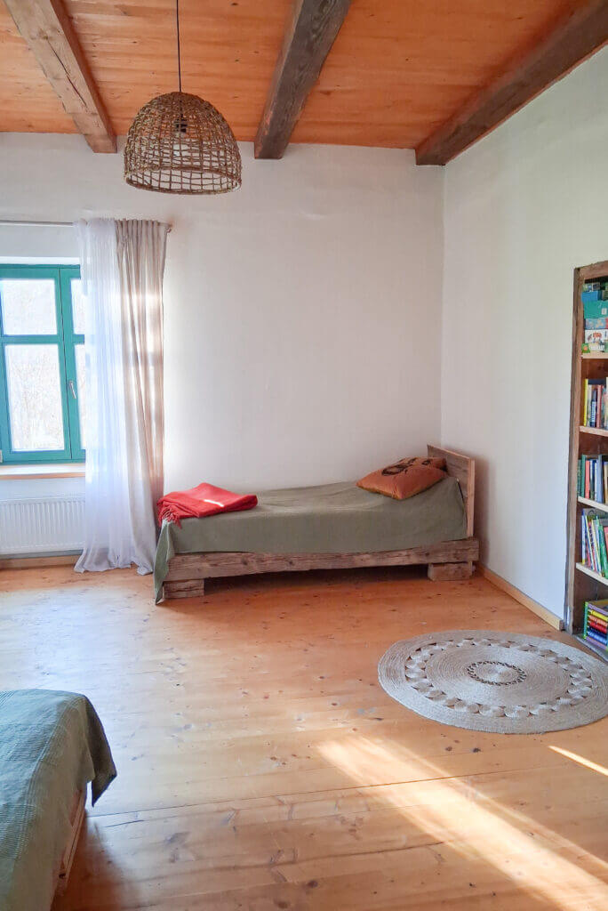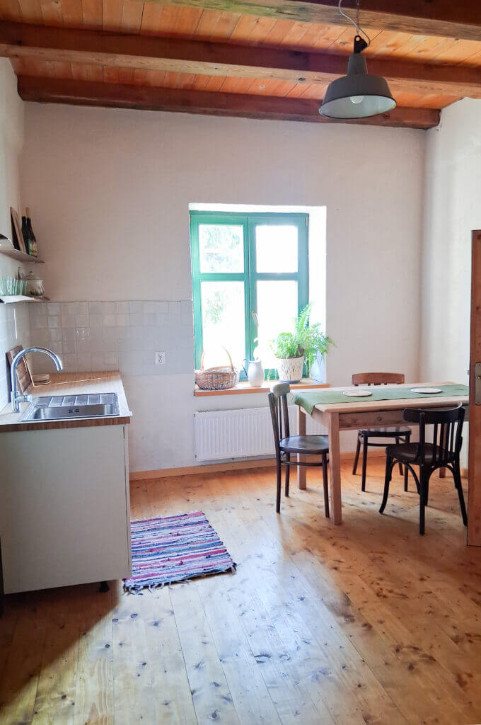 Nasi Goście mają do dyspozycji pokój z własną, przestronną kuchnią i łazienką – część naszego domu z oddzielnym wejściem. Mogą skorzystać z dużego ogrodu z sadem, w którym wydzieliliśmy miejsca do zabawy dla dzieci, miejsce na ognisko czy zakątki gdzie można się zaszyć i odpocząć. Oferujemy też opcję wynajmu rowerów z przyczepką dla dzieci. Chętnie podpowiemy też najlepsze trasy i miejsca warte odwiedzenia w najbliższej okolicy. Na długie wieczory zapewniamy całą masę książek, zabawek i planszówek.